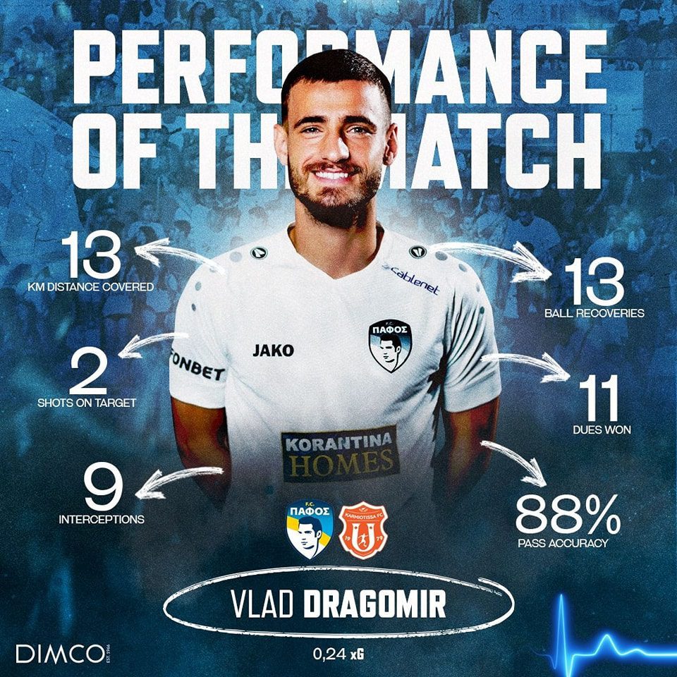 Στην τελευταία αναμέτρηση της ομάδας της Πάφου με την Καρμιώτισσα ο Dragomir σύμφωνα με τους ιθύνοντες της ομάδας οι οποίοι έχουν τα στατιστικά στοιχεία κάθε ποδοσφαιριστή είναι εκείνος που ξεχώρισε.